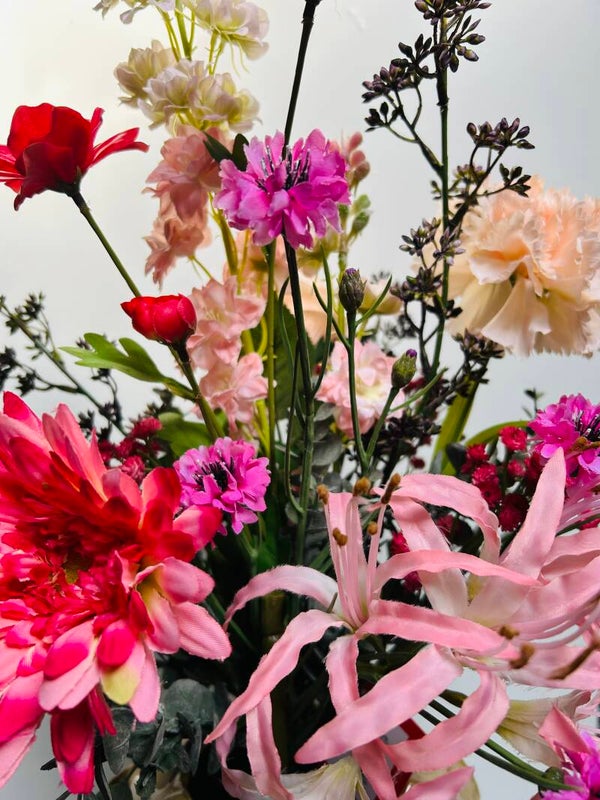 Een fleurig maar weelderige boeket in verschillende roze tinten! Zodra je boeket Roos op tafel hebt staan krijg je meteen zin in het voorjaar!!